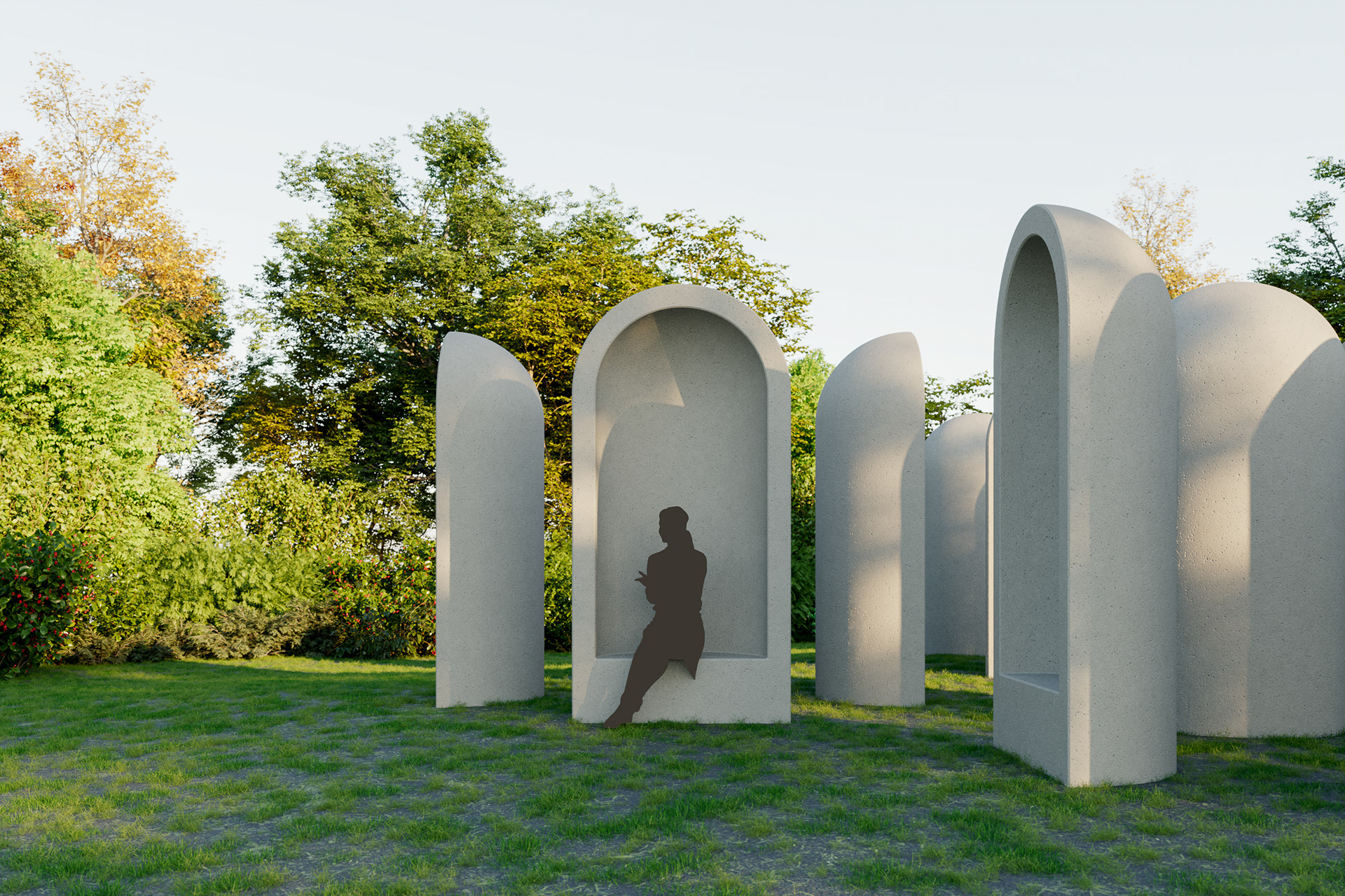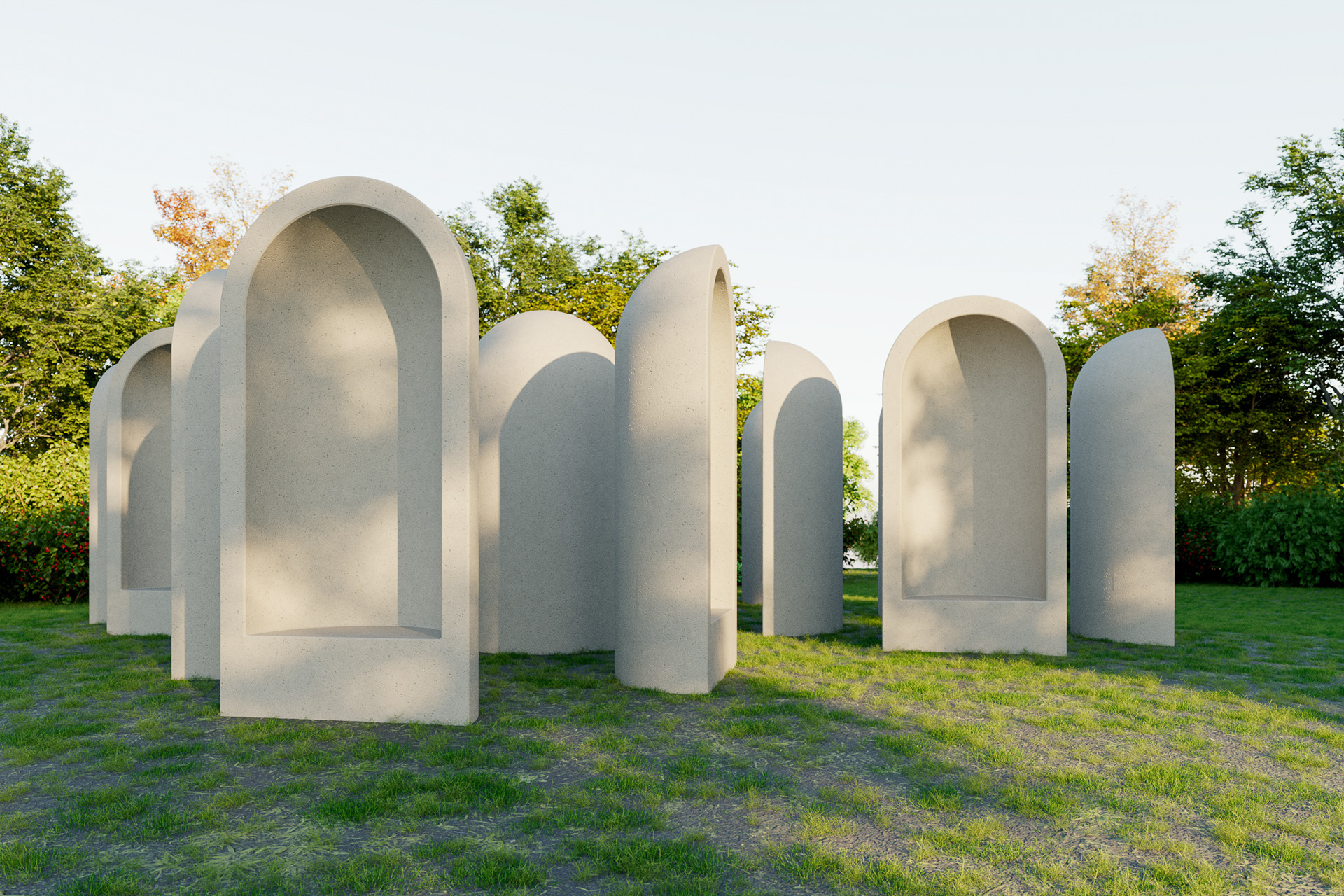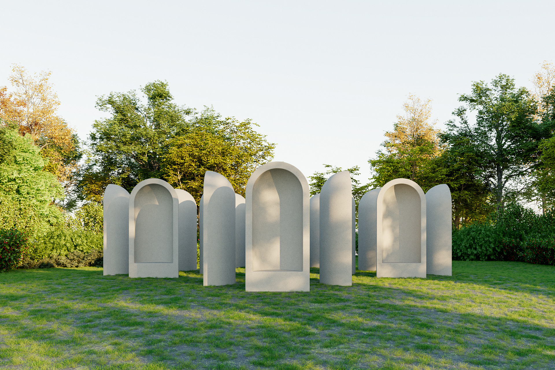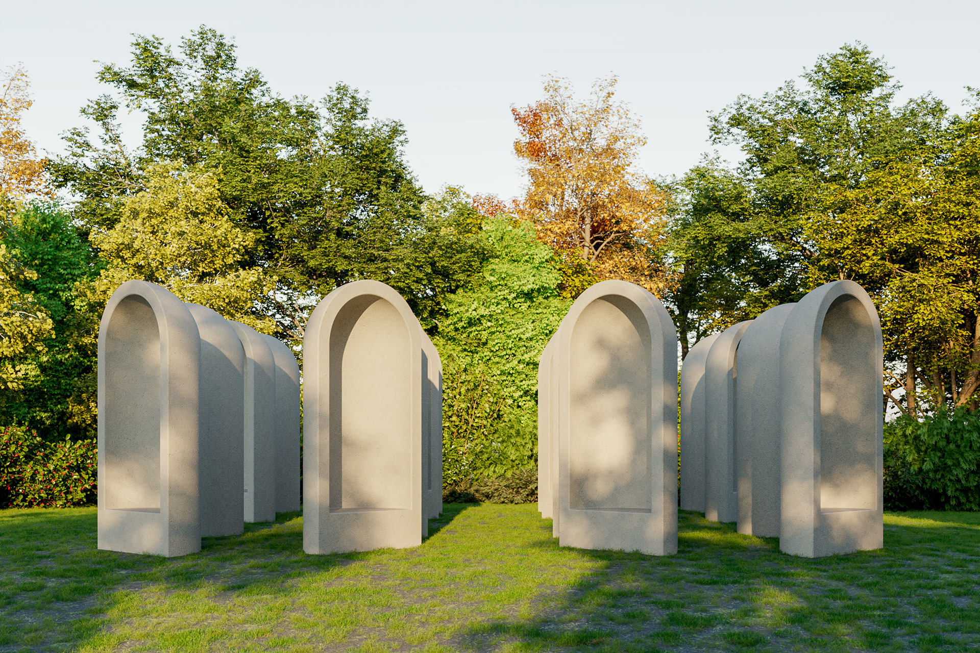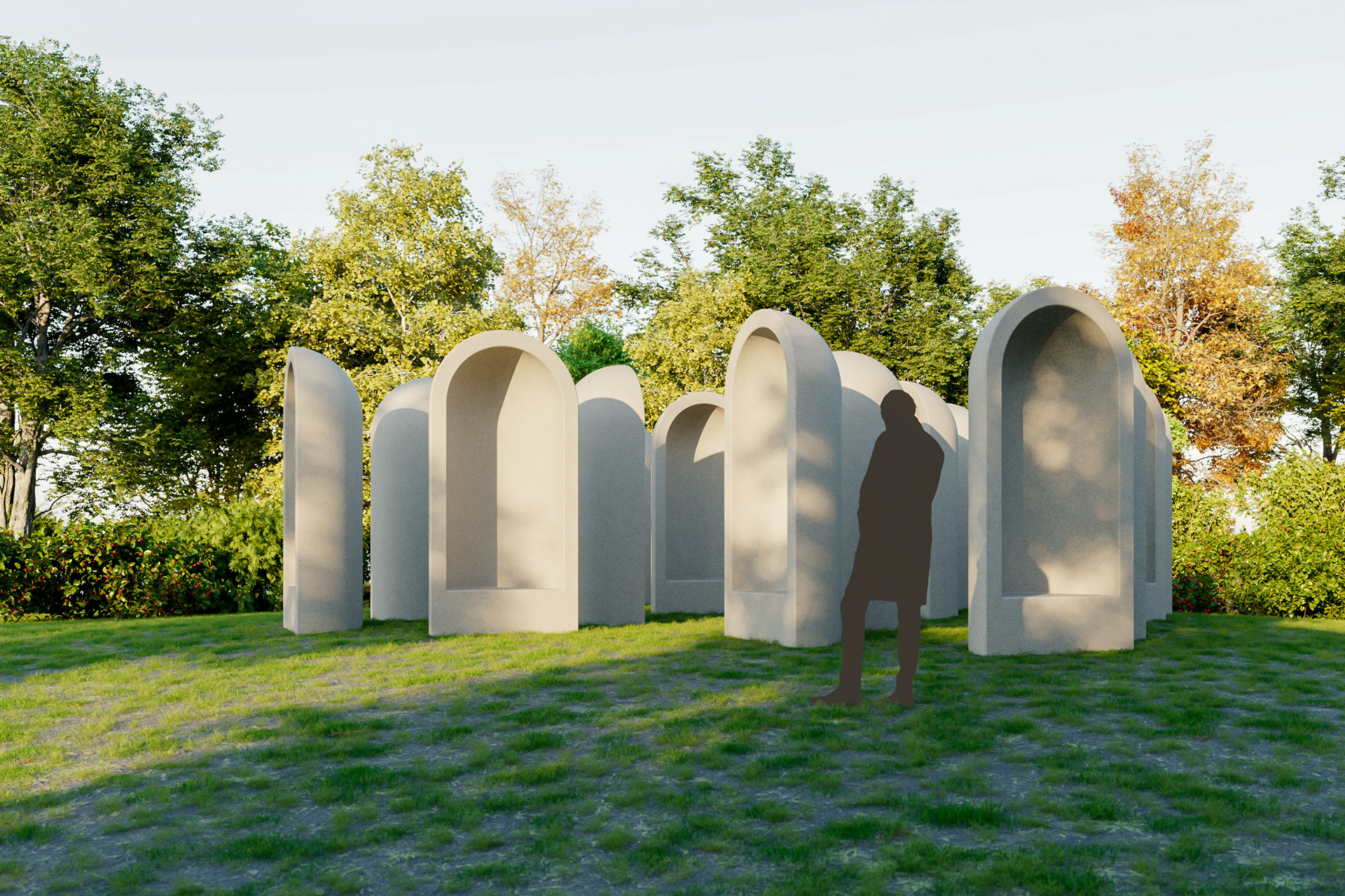 Visualisatie van het kunstwerk "Aedicula" van Renato Nicolodi. Het stiltewerk wordt in het landschappelijke geheel meegenomen in de uitbreiding van het groendomein Abdij van Park te Leuven.