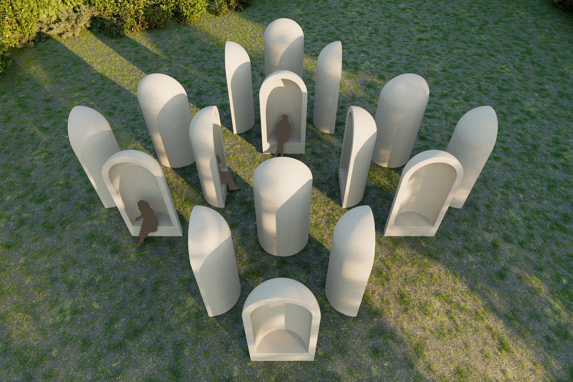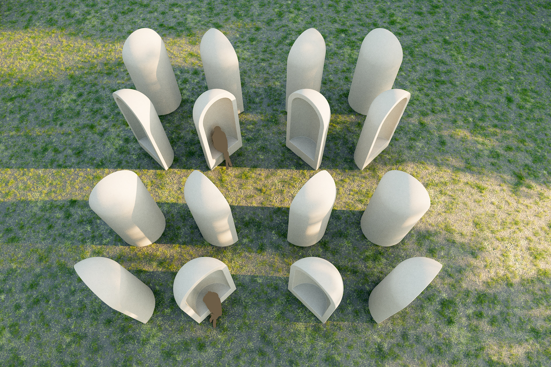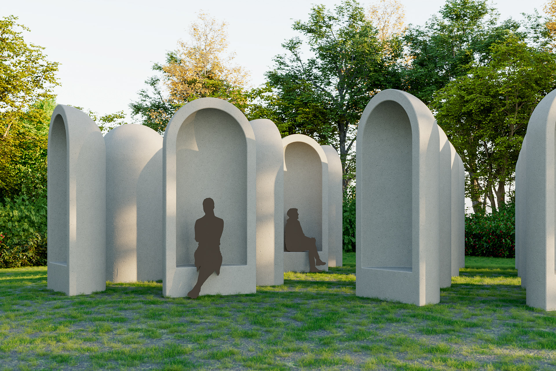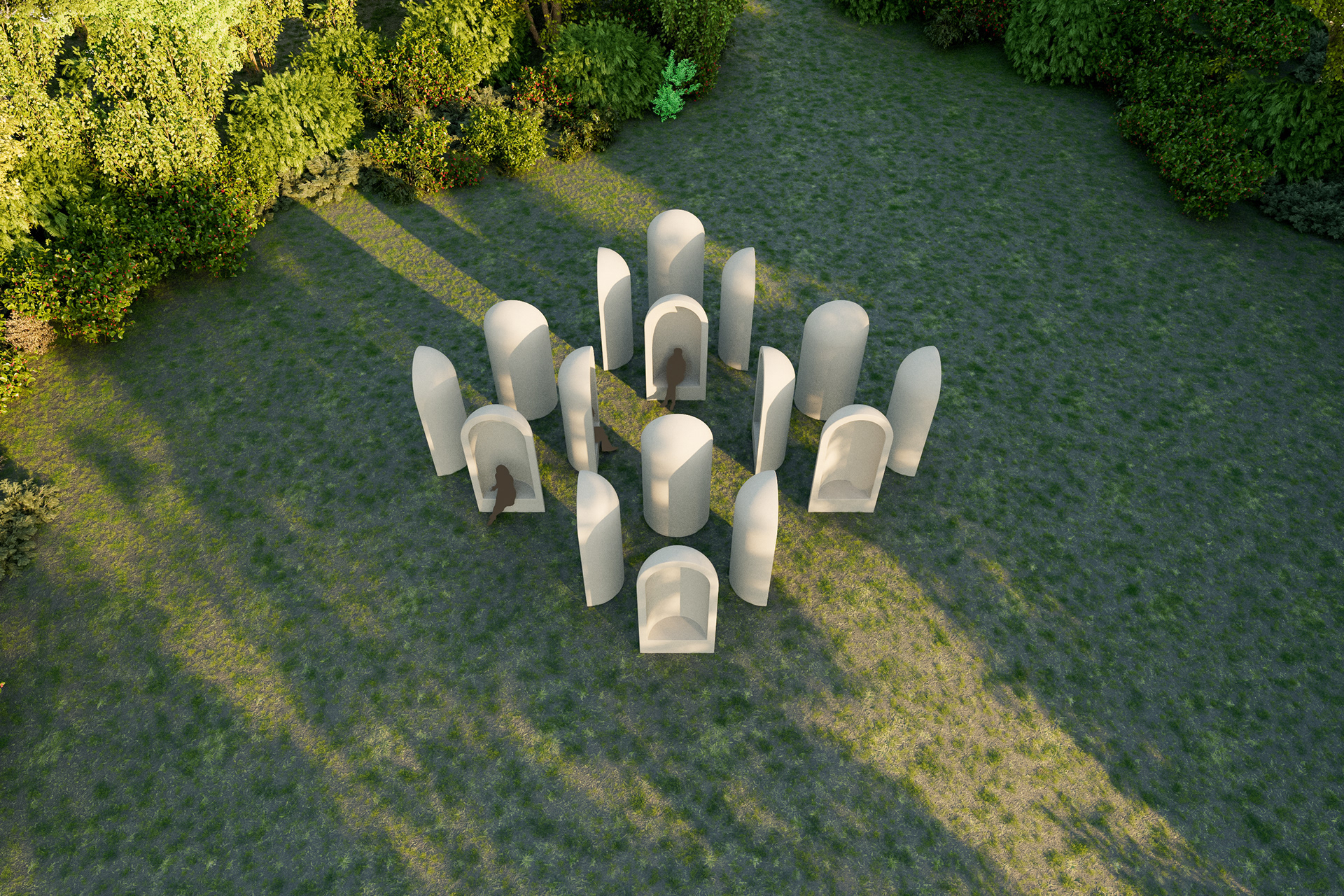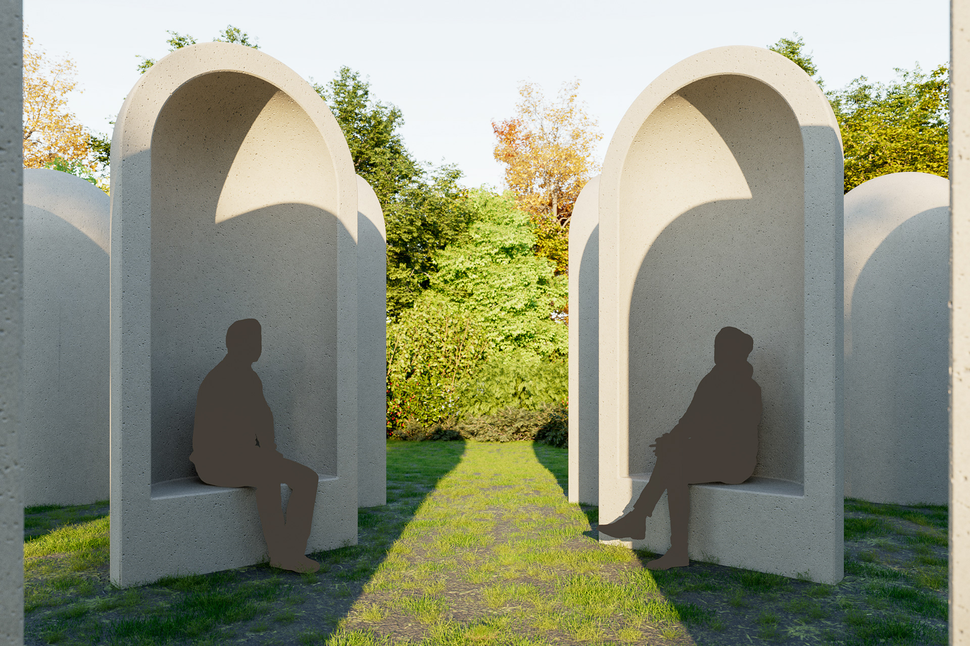 Visualisatie van het kunstwerk "Aedicula" van Renato Nicolodi. Het stiltewerk wordt in het landschappelijke geheel meegenomen in de uitbreiding van het groendomein Abdij van Park te Leuven.